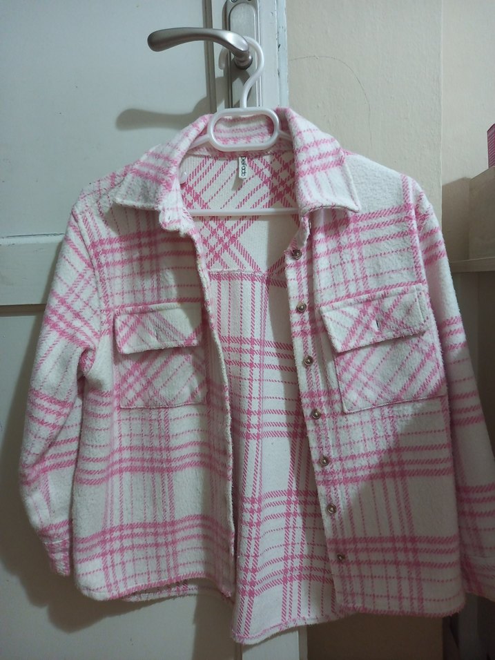 Düğmeli ön kısmı, notalı yaka ve uzun kollu pembe pastel ekose desenli, yumuşak ve sıcak kumaştan yapılmış bol kesim kız çocuk gömleği.