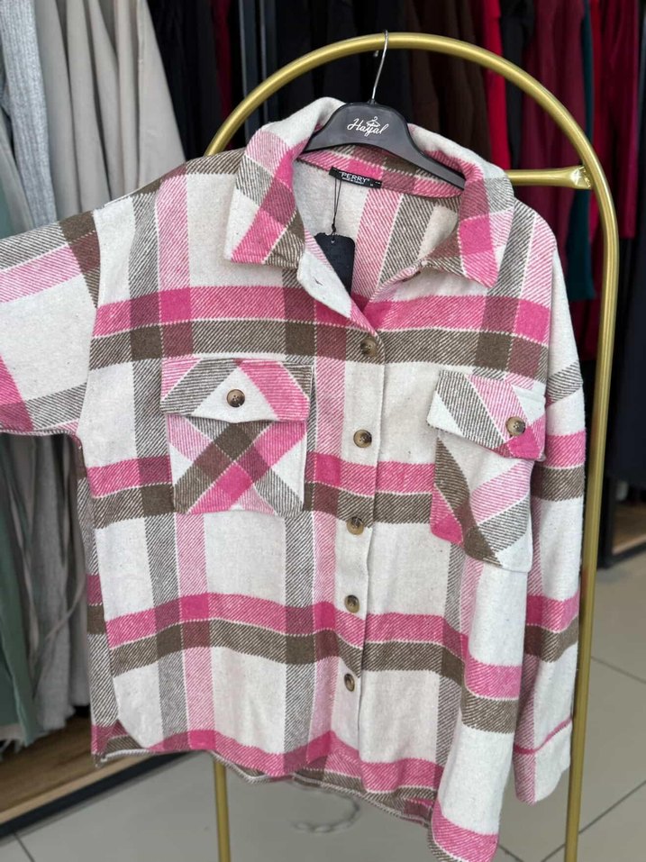 Düğmeli Pembe Ekose Salaş Kadın Gömlek