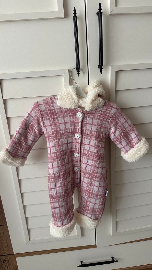 Düğmeli, pembe ekoseli bebek tulumu, notched lapel yaka ve yumuşak, sıcak kapüşon ile manşetlere sahiptir. ❄️ hiç giyilmedi 1 kez yıkandı. Aşırı sıcak tutuyor.