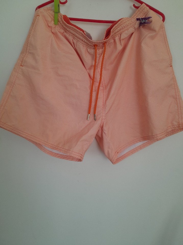 Canlı pembe renkli, düğmeli ve bağcıklı bel detaylı, bol kesim erkek mini şort. Plaj ve sokak tarzı için uygundur.
