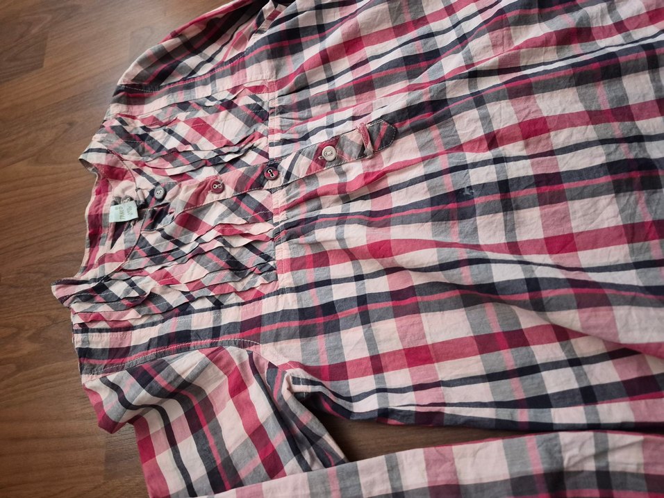 Pembe ve gri ekose desenli, düğmeli ve yakalı, bol kesim kız cocuk gömleği. Normal uzunlukta ve askılı kollu, vintage tarzda gündelik kullanıma uygun.