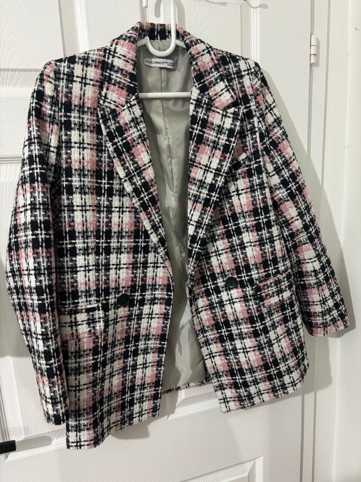 Düğmeli ön ve kesilmiş yaka detaylı, pembe ve gri ekose desenli kadın blazer. Normal kesim, uzun kollu ve midi boyda, sentetik kumaştan üretilmiştir. Günlük kullanıma uygundur.