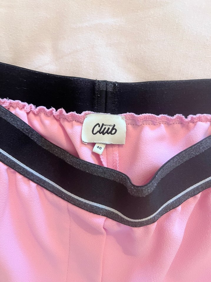 Düğmeli, pembe renkli ve saten dokulu, midi uzunlukta hamile şortu. Sokak modasına uygun, romantik akşamlar için ideal.