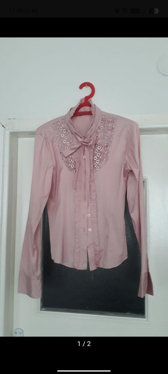 Düğmeli, uzun kollu, yakalı pembe gömlek. Nakış detaylı, normal kesim ve midi boyda, ofis için uygun, trend Paris tarzı gömlek. hakim yaka