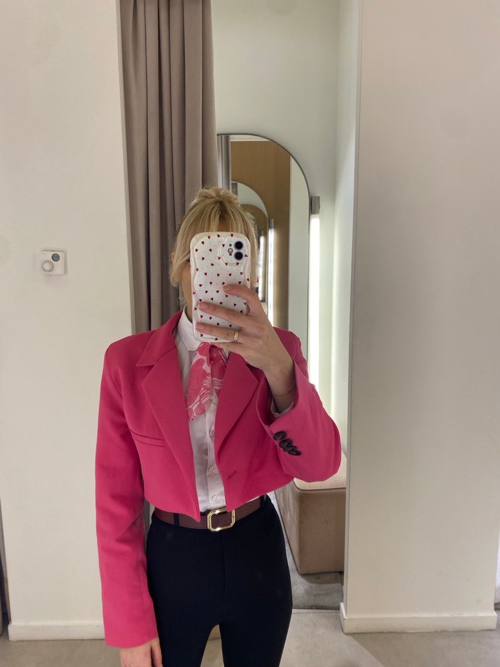 Düğmeli, uzun kollu pembe kadın blazer ceket, normal kesim ve midi boydadır. Ofis için uygun, desensiz ve sentetik kumaştan üretilmiştir.