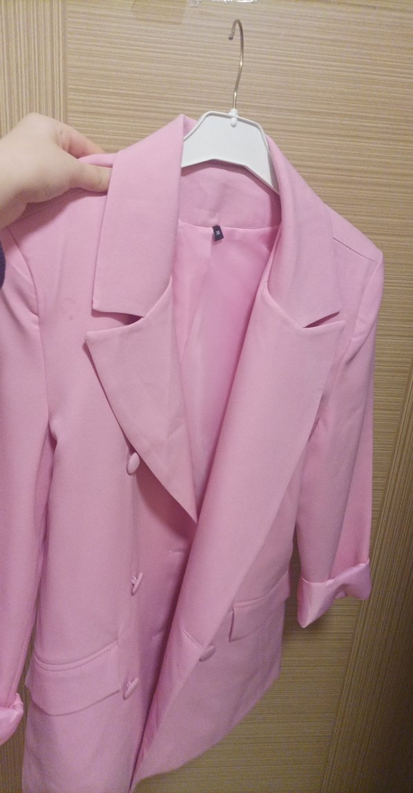 Düğmeli, notched lapel yakalı, uzun kollu, normal midi boyda pastel pembe kadın blazer. Sentetik kumaştan, ofis için uygun sade ve şık tasarım. sadece 1 kere kullanıldı ihtiyaç fazlası ürün