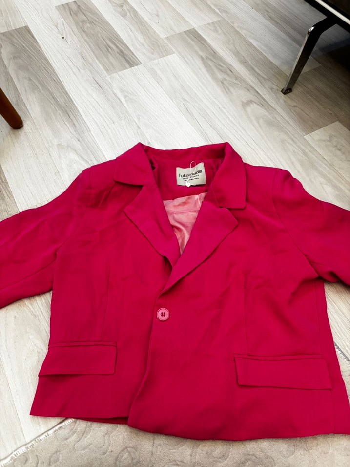 Düğmeli, yakalı ve uzun kollu pembe kadın blazer ceket. Normal midi boyda, regular fit ve ipeksi kumaştan üretilmiştir. Ofis için uygundur.