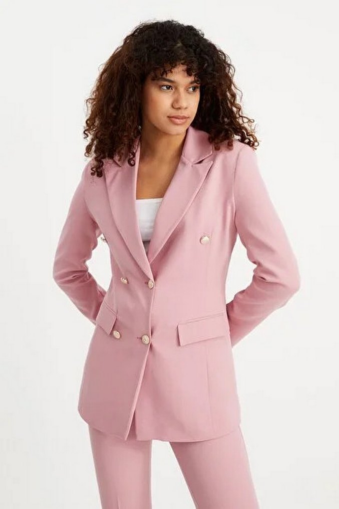 Düğmeli ön ve kesik yaka detaylı, normal kesim ve midi boy pembe kadın blazer ceket. Yumuşak sentetik kumaştan, uzun kollu ve ofis için uygun.
