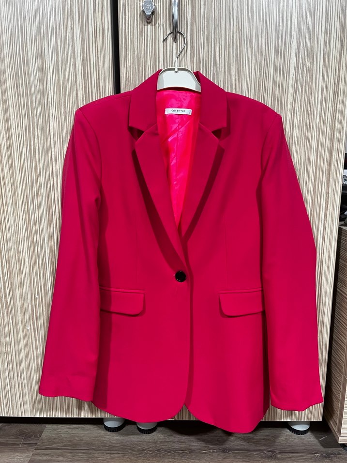 Düğmeli, uzun kesim pembe kadın blazer ceket, notched yaka ve uzun kolludur. Sentetik kumaştan olup ofis kullanımı için uygundur. Düz ve renklidir.