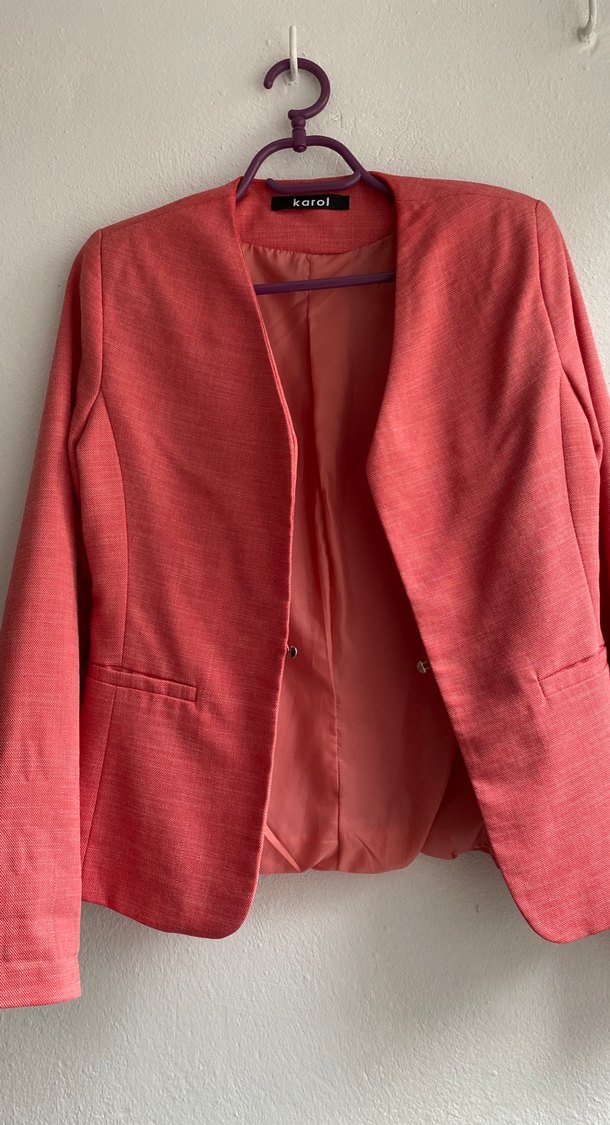 Pembe keten kumaştan, düğmeli ve normal boyda, notch yakalı kadın blazer ceket. Ofis için uygun, parlak dokulu ve sade tasarımlı. Marka: Karol.