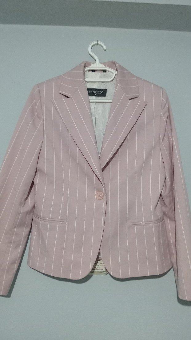 Düğmeli, yakalı pembe kadın blazer ceket, sentetik kumaştan üretilmiş, normal kesim ve uzun kolludur. Ofis ve günlük kullanıma uygundur. 36 38 beden uyumlu küçük kalıp
