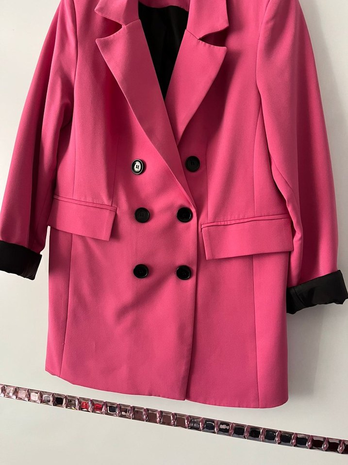 Pembe renkli kadın blazer, kesik yaka, düğmeli ön ve askılı kollara sahiptir. Normal kesim, midi boy ve sentetik kumaştan üretilmiştir. Ofis ve sokak stili için uygundur.