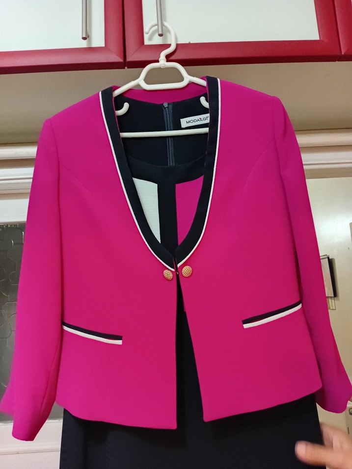 40 beden bir kez giyilmis deforme yırtık yok Kadınlar için düğmeli, koyu pembe renkte, notched lapel yakalı, uzun kollu, normal midi uzunlukta ve regular fit kesime sahip blazer ceket. Ofis kullanımı için uygundur.
