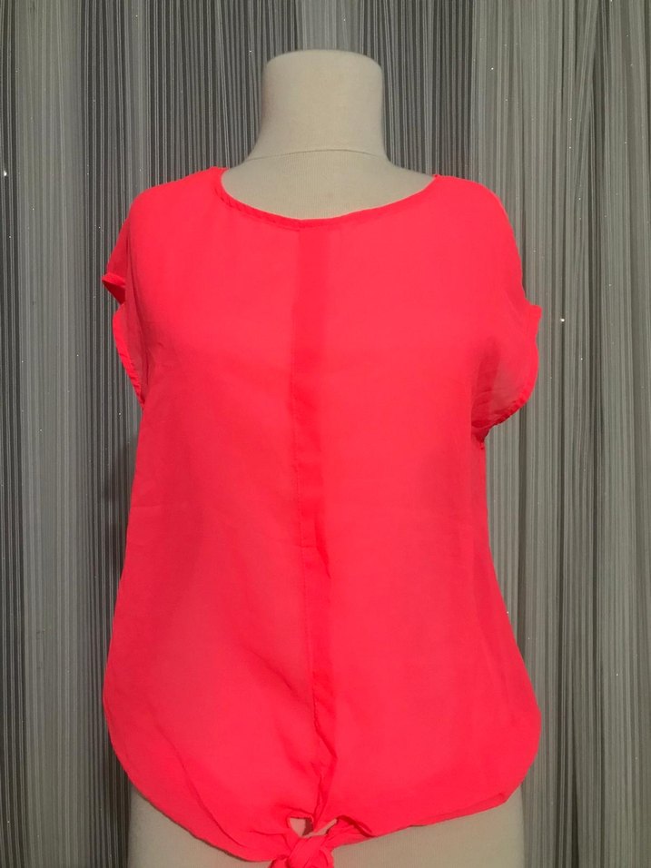 Pembe renkte, kısa kollu, yuvarlak yakalı ve bol kesim kadın bluz. Düğmeli ve bağlamalı etek ucu, yumuşak sentetik kumaştan, günlük kullanım için uygun.