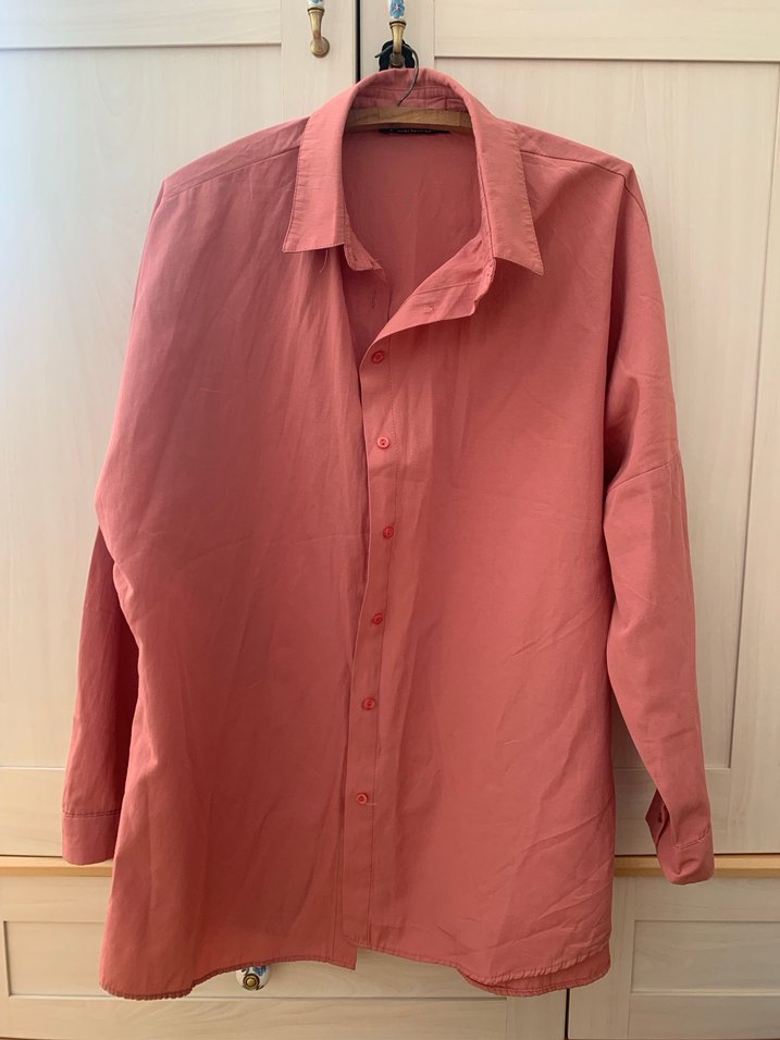 Pembe kadın gömlek, düğmeli, yakalı ve uzun kolludur. Salaş kesimi ve midi boyu ile ofis için uygundur. Minimalist, normcore tarzda sade ve pastel görünüme sahiptir. Oversize bir ürün, anneme almıştım fakat olmadı dolayısı ile ürün hiç giyilmedi. Etiketi 42 fakat oversize olduğu için 44 bedene kadar rahatlıkla olur. Hiçbir sorunu ve kusuru yok
