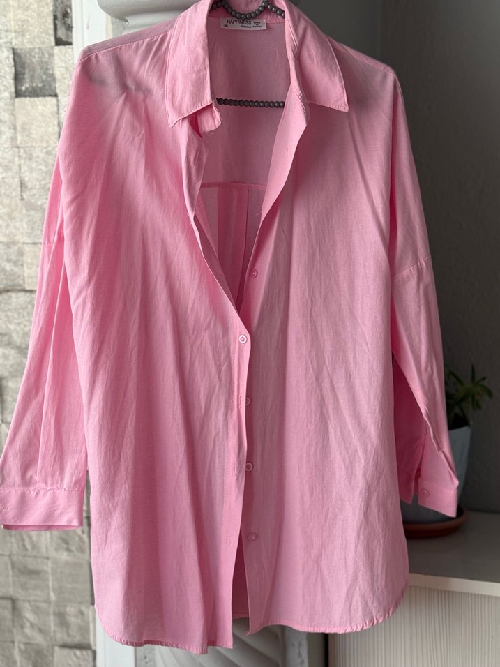 Düğmeli, uzun kollu, yakalı pembe kadın gömlek. Rahat kesim, midi boy ve desen içermeyen sade tasarım. Günlük kullanım için uygun, normcore tarzında.
