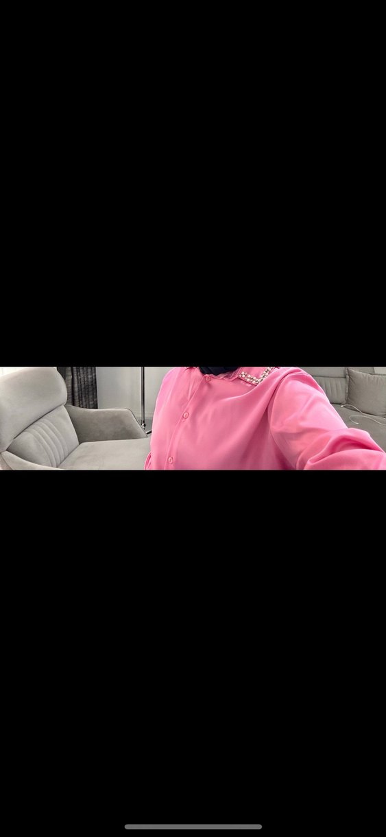 Düğmeli, yakalı, uzun kollu pembe kadın gömlek. Parlak, ipeksi kumaştan, cesur ve minimalist tarz için uygun.