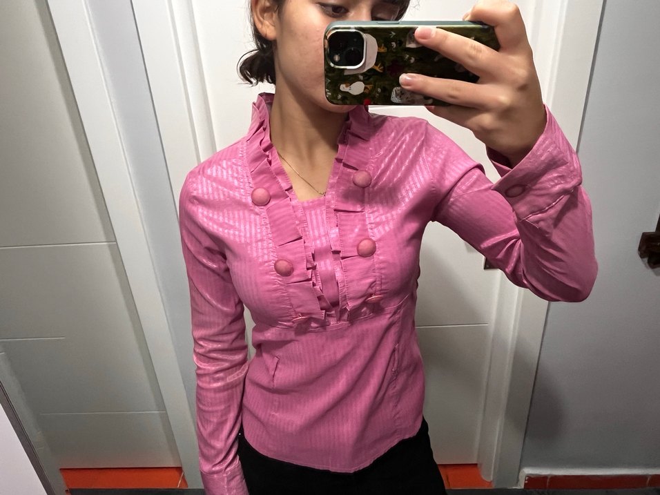 Düğmeli, yakalı ve uzun kollu, pastel pembe renkli, baskılı desenli, vücuda oturan kadın gömleği. Ofis kullanımı için uygundur. Son fotoğrafta defosu mevcut