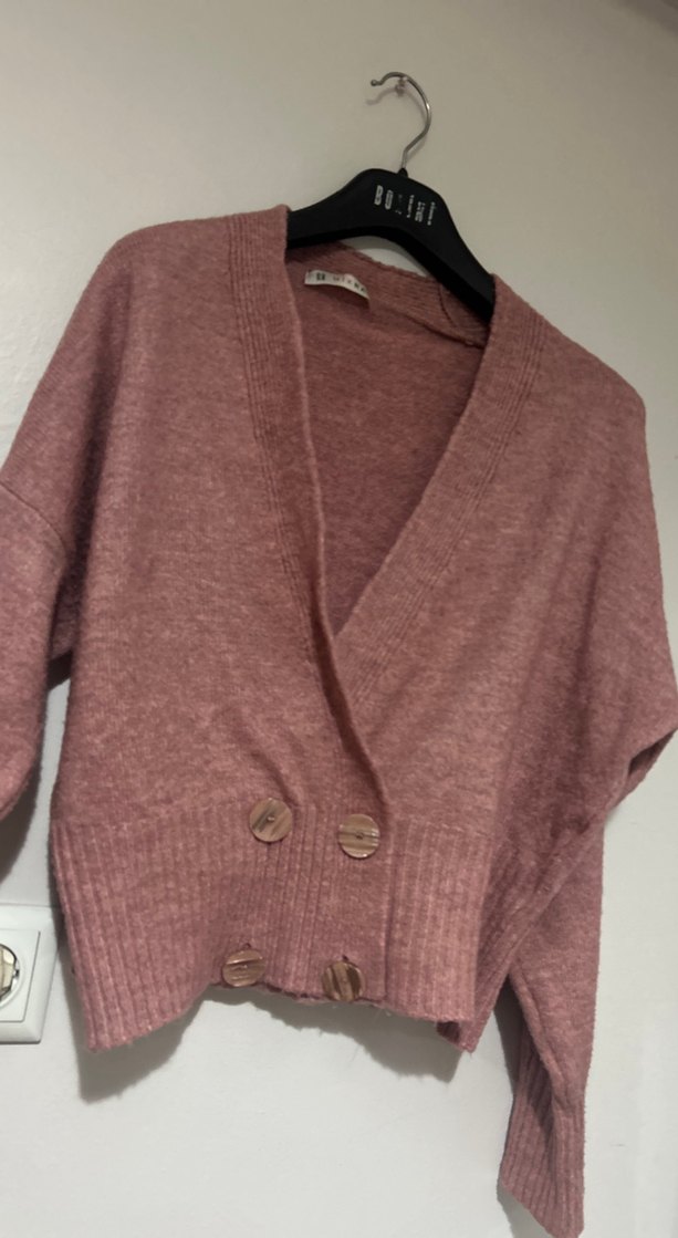 Düğmeli pembe triko hırka, kesik yaka ve uzun kolludur. Rahat kesim ve normal midi boydadır. Günlük kullanıma uygundur.