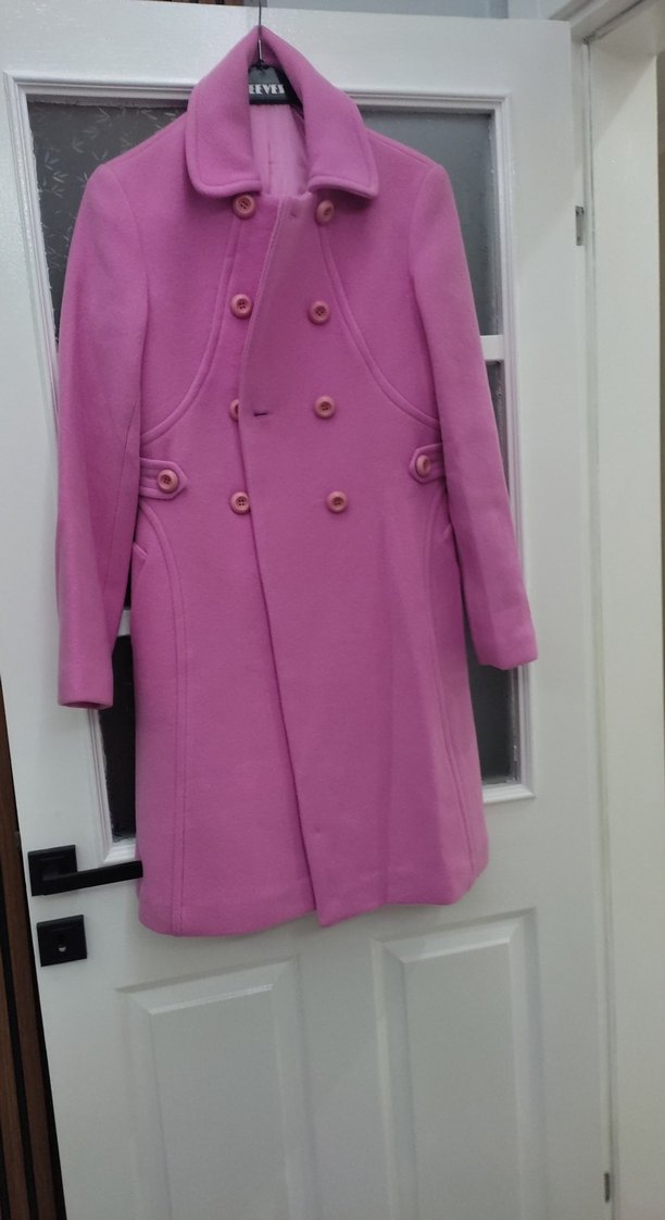 Çift düğmeli pembe kadın kaban, klasik yakalı ve yan cepli. Yumuşak ve rahat kumaşıyla sıcak tutar.