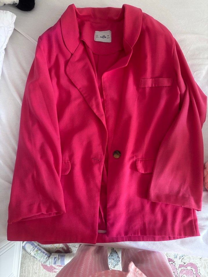 Düğmeli, keten kumaştan yapılmış pembe blazer ceket. Uzun kollu, normal boyda ve notched lapel yakaya sahiptir. Günlük kullanıma uygundur.