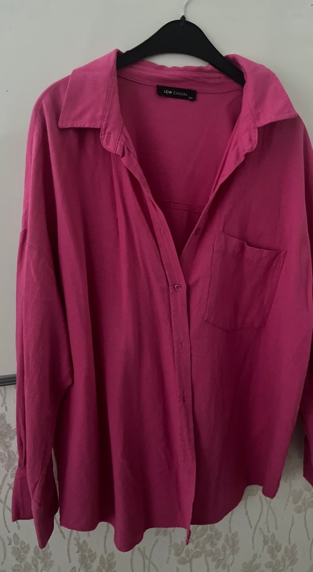 Bol kesim, uzun kollu pembe keten gömlek. Düğmeli ve yakasında çentikli detay bulunur. Cep ve sade tasarımıyla günlük kullanıma uygundur.