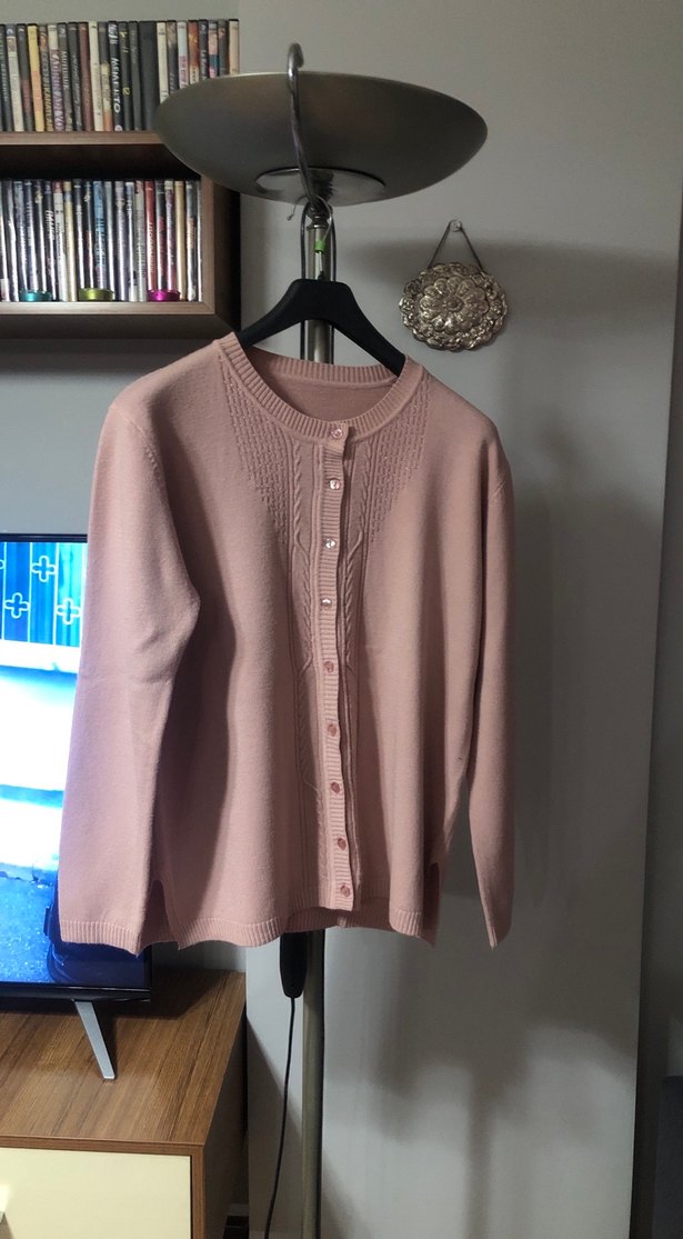 Düğmeli, yuvarlak yaka ve uzun kollu bol kesim pembe hırka. Yumuşak örme kumaştan, rahat ve gündelik kullanıma uygun midi boyda pastel tonlarda.
