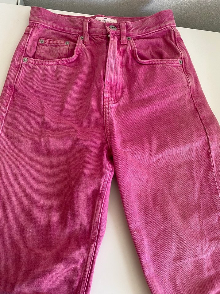 Düğmeli, pembe renkte, normal midi uzunlukta oturan kadın kot pantolon. ✨