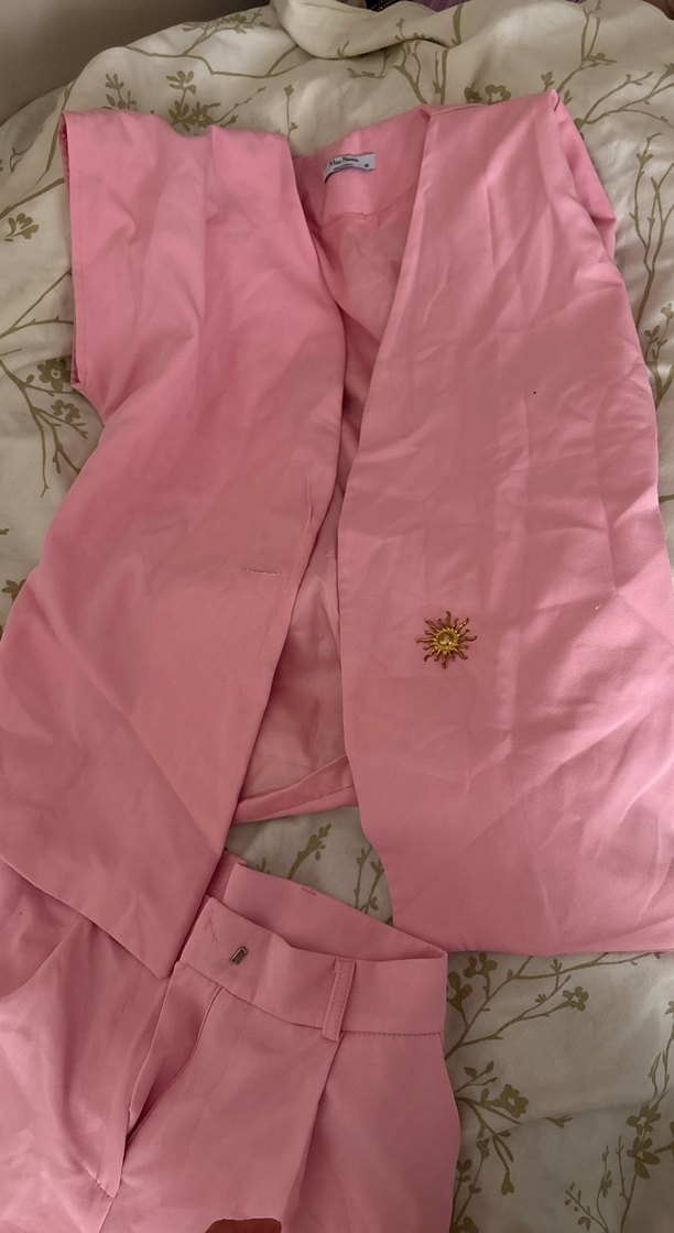Düğmeli, nakışlı detaylı, ipek dokulu pembe kadın midi takım. Salaş kesim, yakası kesik ve kolsuz, günlük kullanım için uygundur.