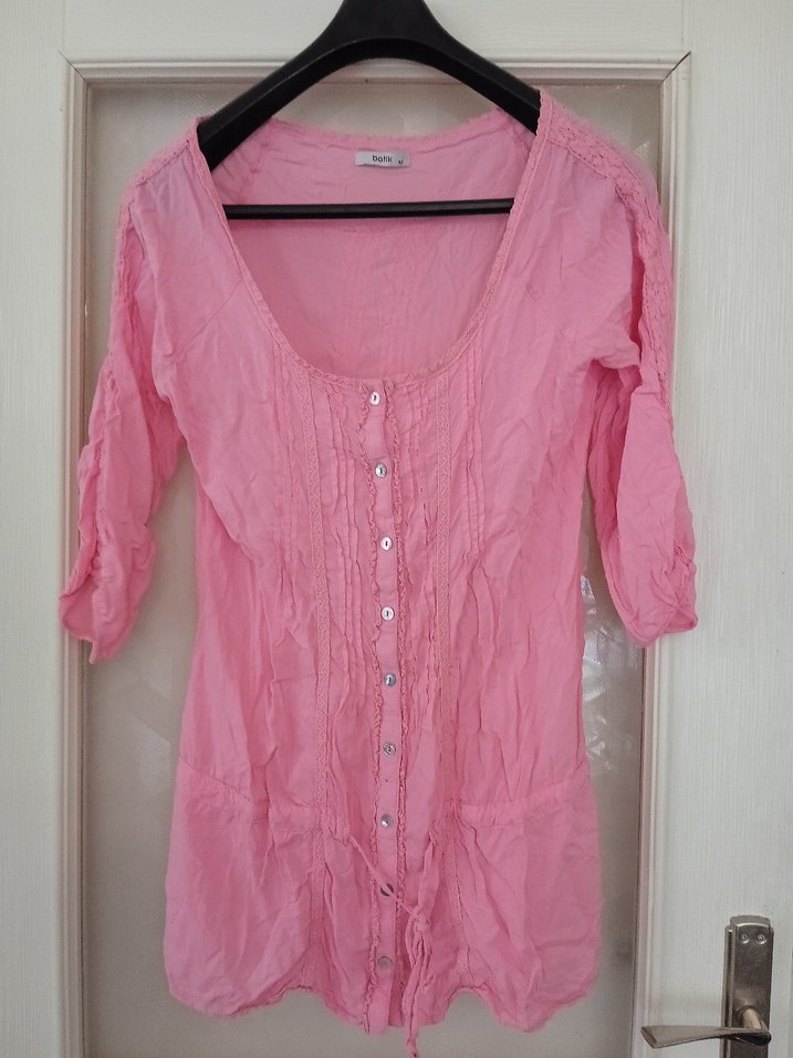 Düğmeli, uzun kollu, V yaka, bol kesim pembe pamuklu kadın plaj giysisi.