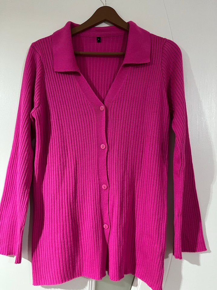 Pembe triko hırka, yakalı ve uzun kolludur. Düğmeli ön kısmı ve bol kesimiyle rahat bir kullanım sunar. Pastel tonuyla yumuşak bir görünüm sağlar.