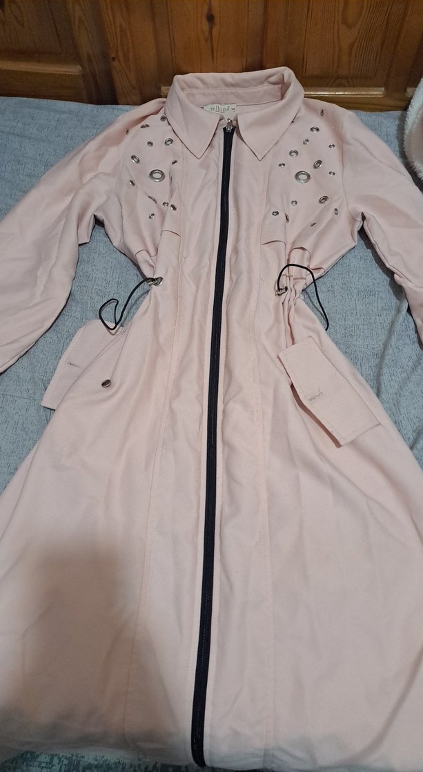 Düğmeli, uzun kesim ve pembe tonlarında, yakası kesimli, düğmeli ve uzun kollu kadın trençkotu. Sokak modasına uygun, desen içermeyen şık tasarım. Sadece arka kısmında küçük bir nokta var onun dışında gayet temiz .