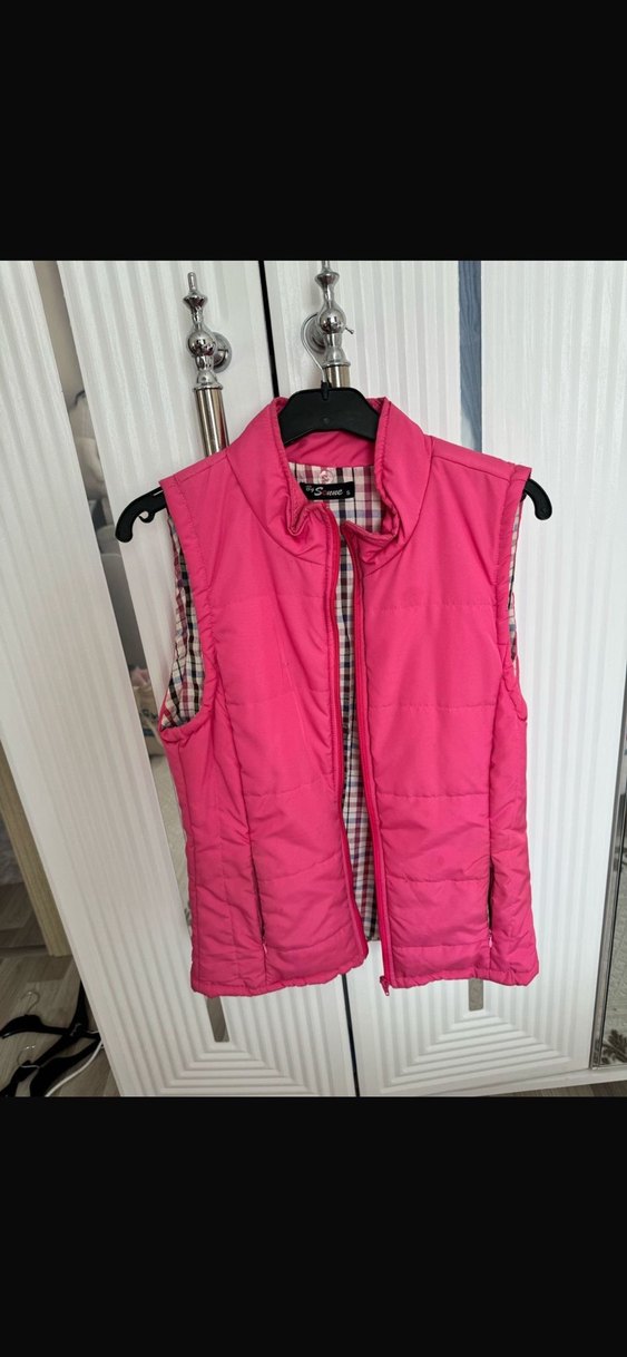 Düğmeli, straplez yakalı, pembe renkli, suni kumaştan yapılmış, parlak görünümlü, normal boy, dar kesim kadın yelek.