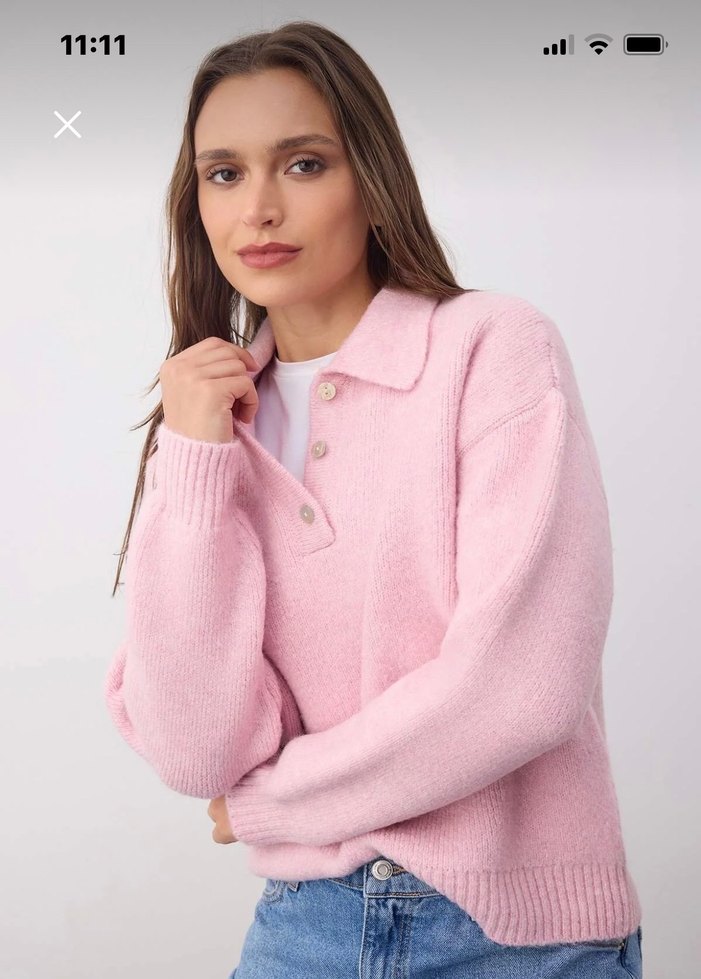 Bu pastel pembe yün kazak, düğmeli ve yakalıdır. Bol kesim, uzun kollu ve normal boydadır, rahat kullanım için uygundur. Hiç giymedim