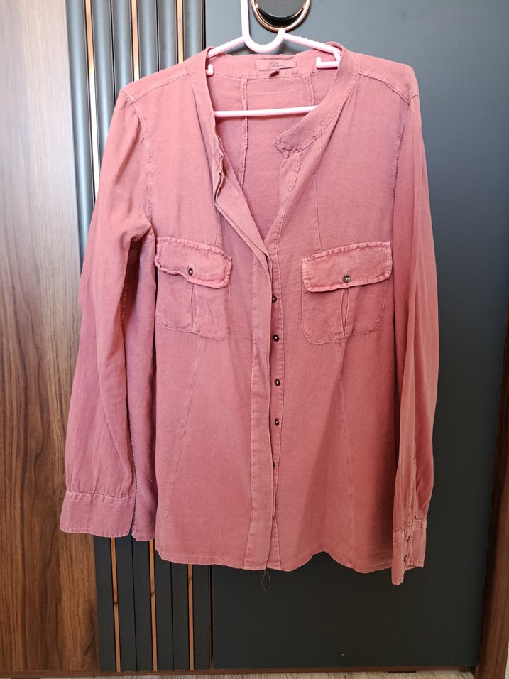 Pembe uzun kollu, düğmeli ve cep detaylı, notched lapel yakalı, bol kesim midi uzunlukta kadın gömleği. Günlük kullanıma uygun bohem tarz. Yumuşak bir kumaşı var kalitelidir.