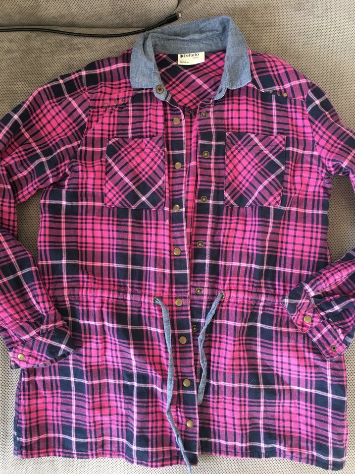 Uzun kollu, düğmeli ve yakalı çocuk gömlek. Gevşek kesimli, midi boyda, koyu pembe kareli desene sahip, günlük sokak tarzına uygun.