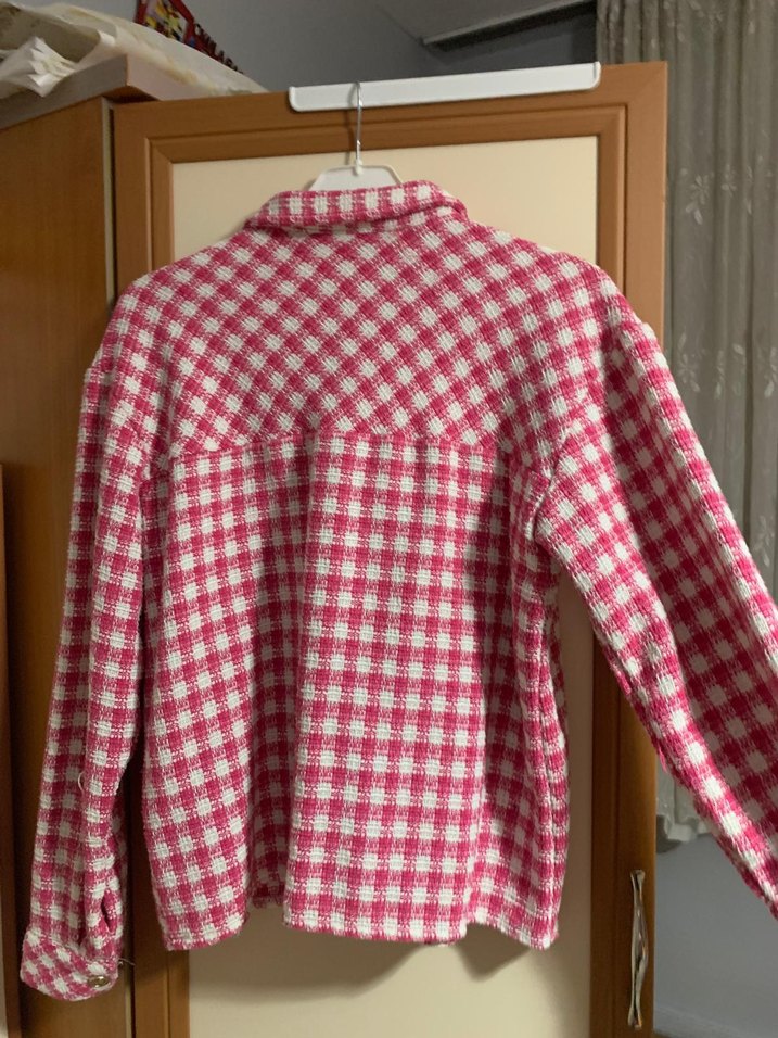 Pembe kareli, düğmeli, uzun kollu, kız çocuk gömlek 1 kere giyildi tertemiz