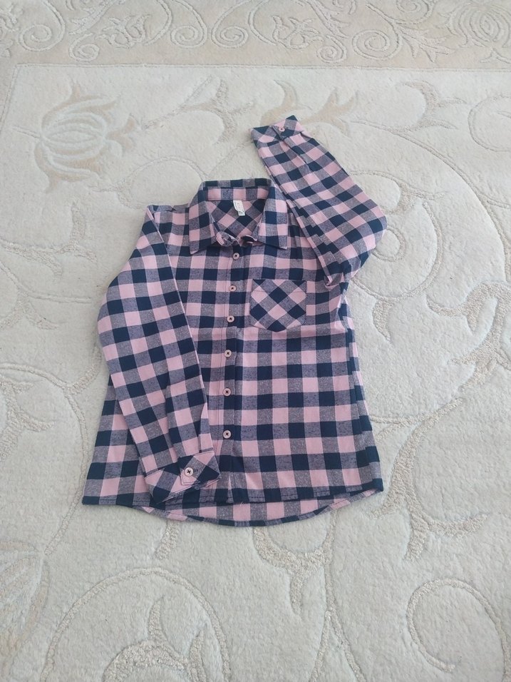 Düğmeli, uzun kollu pamuklu kız çocuk gömleği, rahat kesim ve yakalı tasarıma sahiptir. Pastel pembe kareli deseniyle günlük sokak stiline uygundur.