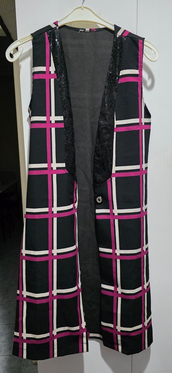 Düğmeli ve cepli, uzun kesim, pembe kareli kadın yelek. Notlu yaka ve regular fit ile avant-garde goth tarzına uygun.