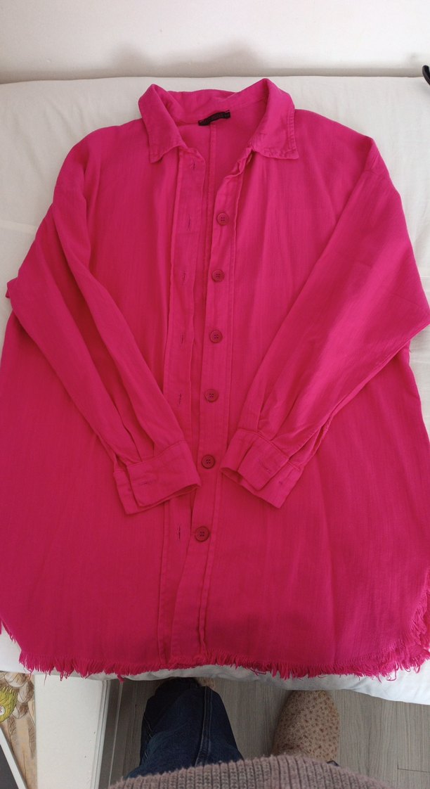 Düğmeli önü ve yakası kesimli, uzun kollu pembe keten gömlek. Parlak, desensiz kumaşıyla rahat ve bohem bir tarz sunar.