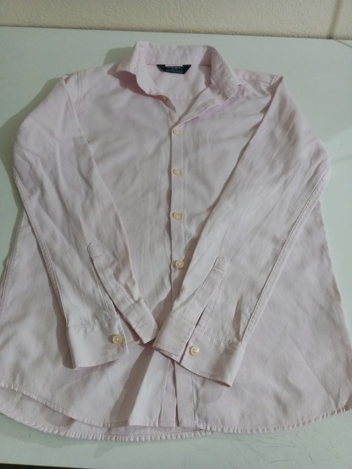 Pastel pembe keten gömlek, düğmeli, yakalı ve uzun kolludur. Düzenli kesimi ve desensiz yapısıyla günlük sokak stiline uygundur.