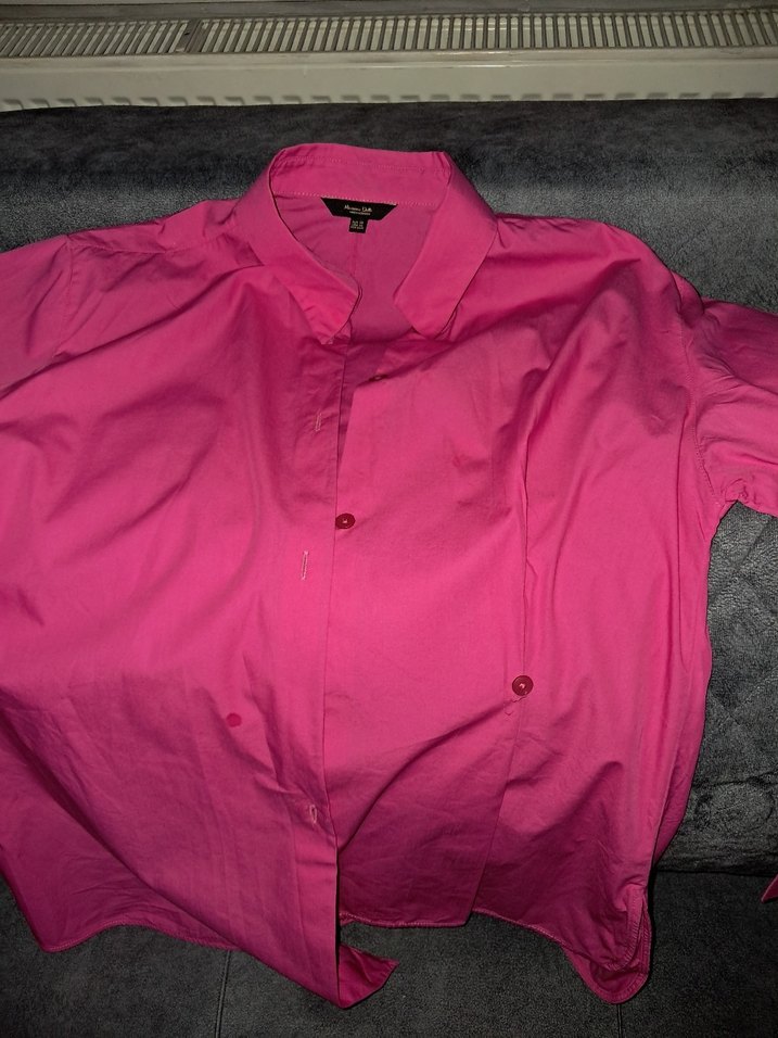 Düğmeli, yakalı ve uzun kollu, dar kesim pembe keten gömlek. Parlak görünümlü, günlük rahat kullanıma uygun.