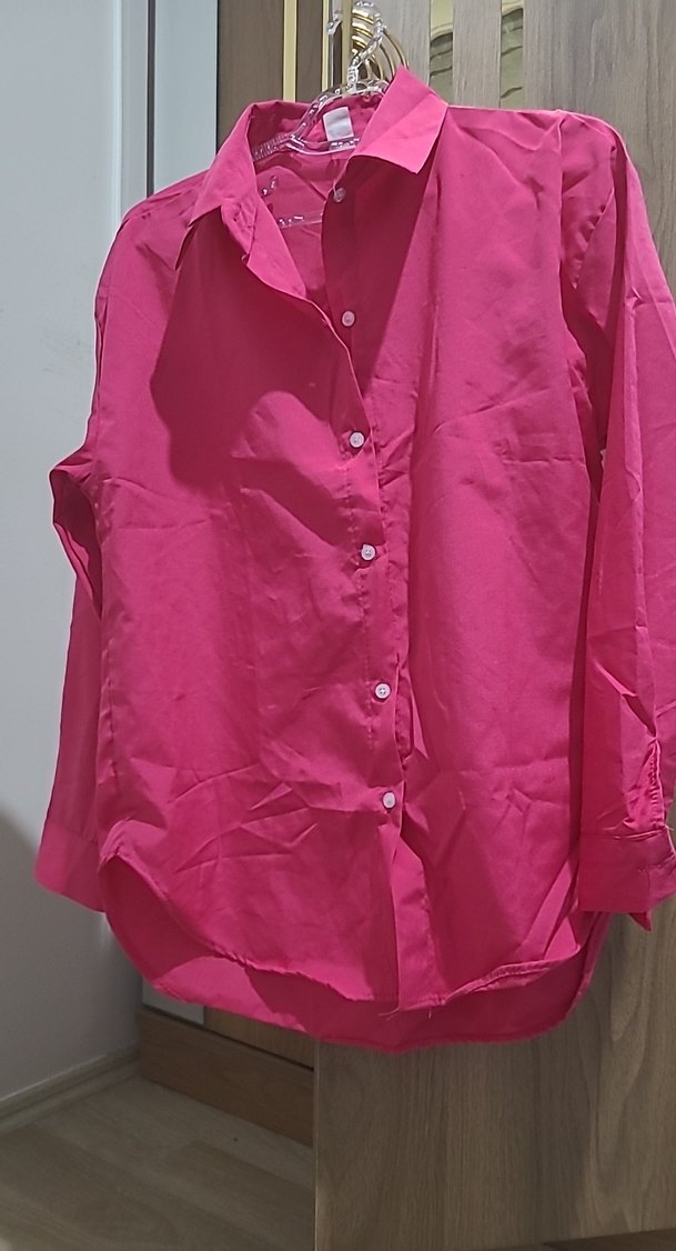 Düğmeli, uzun kollu, yakalı pembe keten gömlek. Salaş kesim, normal boy, günlük rahat kullanım için uygundur. ✨
