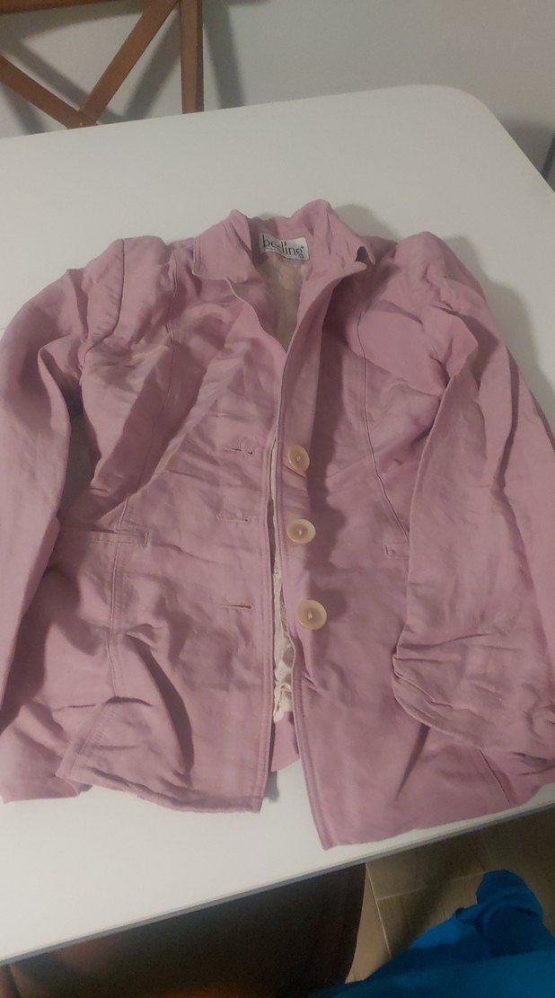 Pastel pembe renkte keten kumaştan, düğmeli, uzun kollu, normal midi boyda, notched lapel yakalı ve bol kesim kadın ceketi. Günlük kullanım için uygundur.