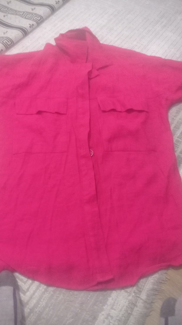 Düğmeli ön cep detaylı, notched lapel yakalı, uzun kollu pembe keten gömlek. Rahat kesim, günlük kullanıma uygun.