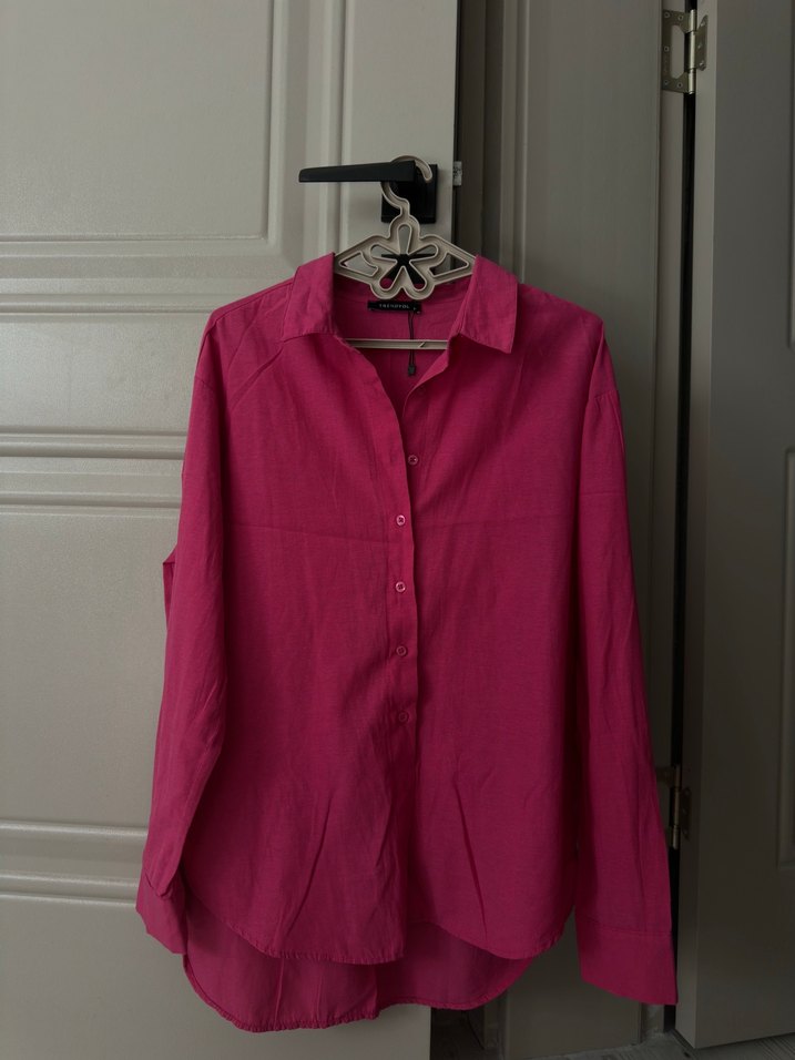 Düğmeli önü, yakalı ve uzun kollu pembe keten gömlek. Rahat kesimli, normal midi boyda, günlük kullanım için uygundur. ✨