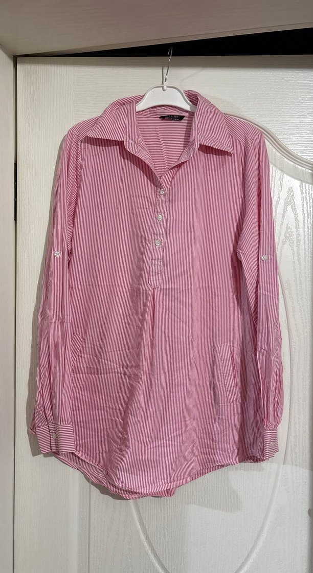 Düğmeli önü, yakalı, uzun kollu pembe keten gömlek. Salaş kesim, günlük kullanım için uygun. 80 cm