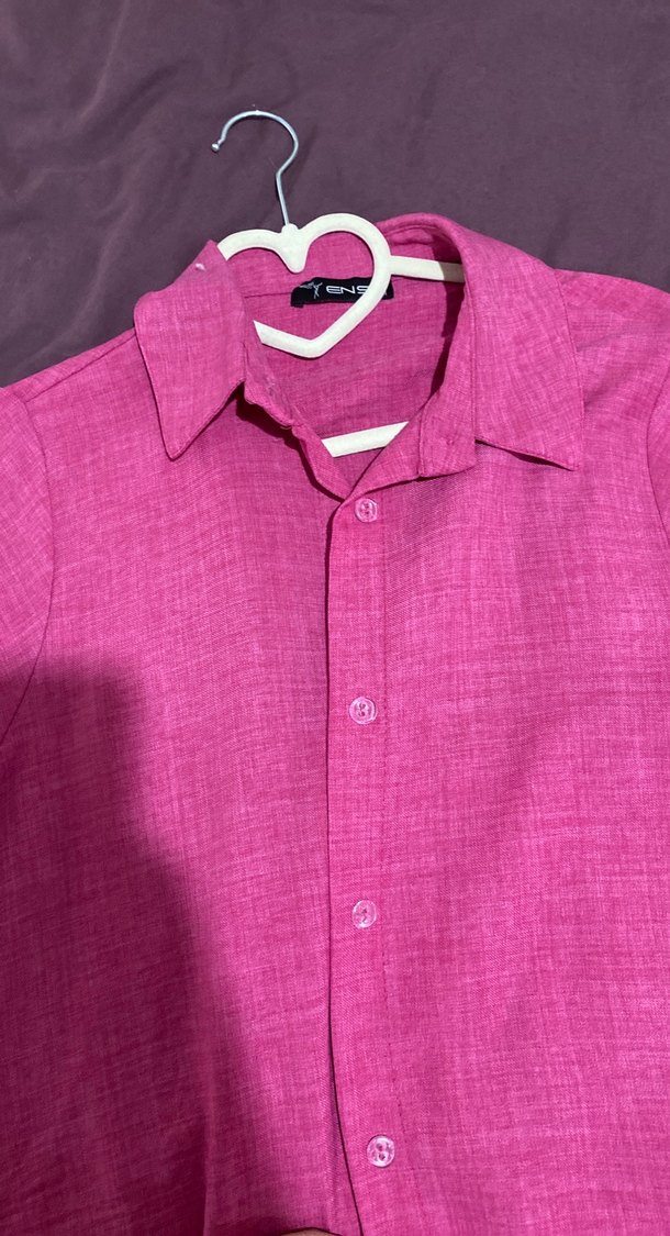 Pembe keten kadın gömlek, düğmeli ve yakalıdır. Kısa kollu, normal kesim ve günlük kullanıma uygundur. ✨