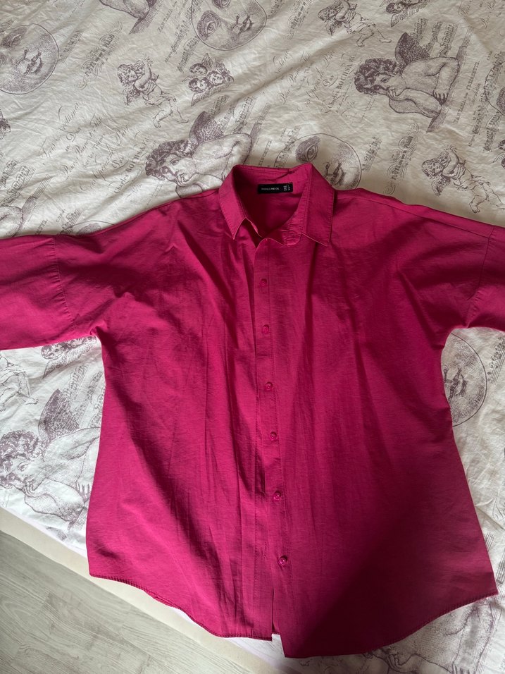 Pembe keten gömlek, düğmeli, kısa kollu ve yakalıdır. Salaş kesimi ve normal boyu ile gündelik rahat kullanım için uygundur.