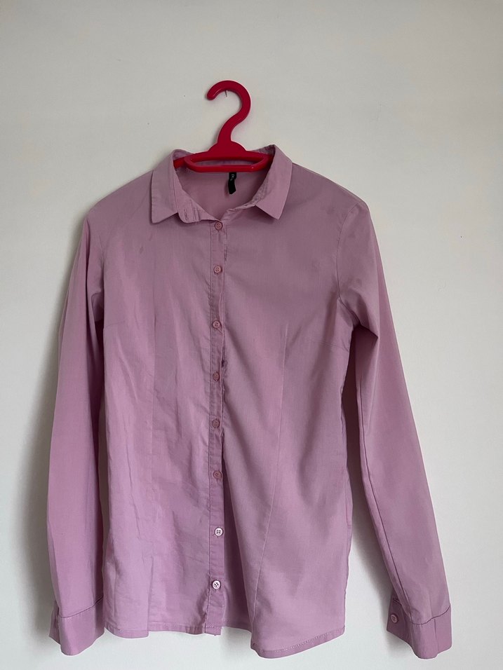 Düğmeli, yakalı ve uzun kollu keten kumaştan yapılmış kadın gömleği. Pastel pembe renkte, normal kesim ve sade tasarıma sahiptir. Günlük kullanım için uygundur.